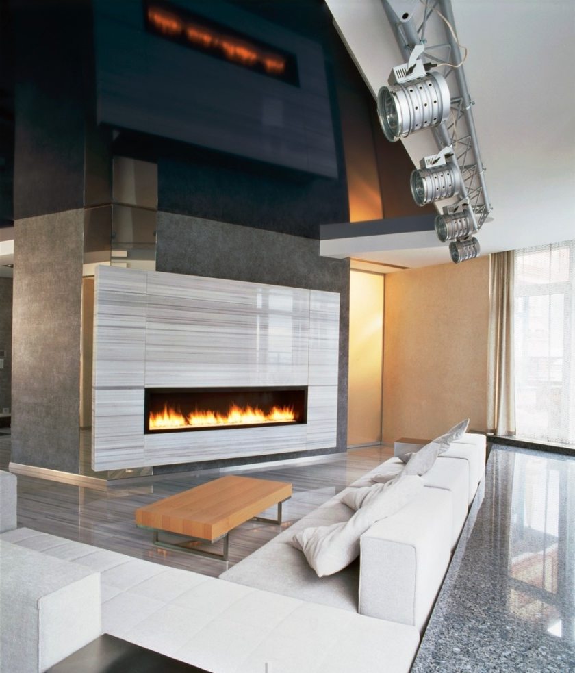 Базовыми цветами данного стиля принято считать белый, серый, черный, коричневый и бежевый. Однако из всякого правила бывают исключения и здесь можно дать волю фантазии. Например, зонировать пространство гостиной можно с помощью потолка. При этом он может быть не только многоуровневым, но и многоцветным. Например, основная гамма комнаты белая, а над диваном можно сделать оливковый или серебристый участок.