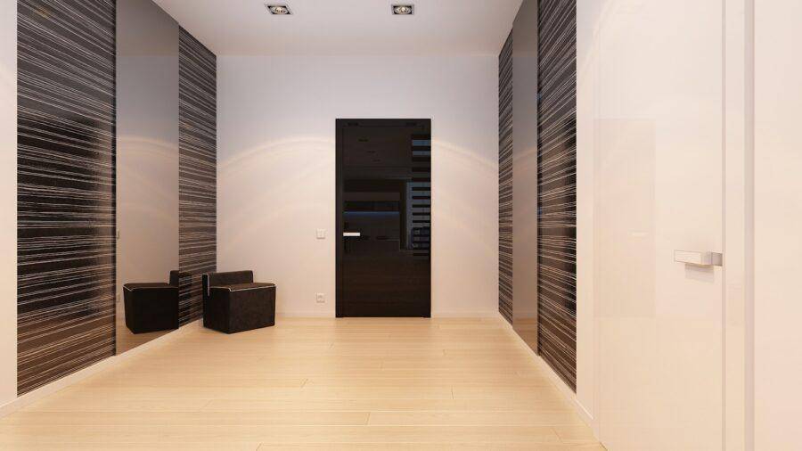 Дверные проемы нагромождают и усложняют восприятие обстановки прихожей. Чтобы минимизировать или выделить их образы на картине интерьера, следует подобрать межкомнатные двери с импонирующими хай-теку чертами: