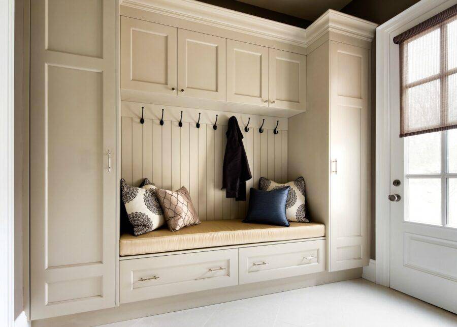 Популярны встроенные или модульные системы. Они экономят пространство, сохраняют цельное впечатление от помещения. Продумывают системы размещения, эргономичные места для головных уборов, обуви, одежды, банкетки, скамьи, пуфы.