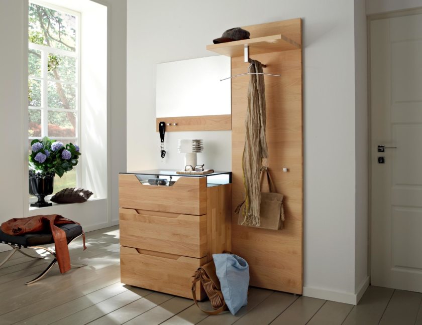 Открытая вешалка и обувница располагаются рядом с входной дверью. Не помешает разместить неподалеку пуфик и выделить специальную полку для сумок.