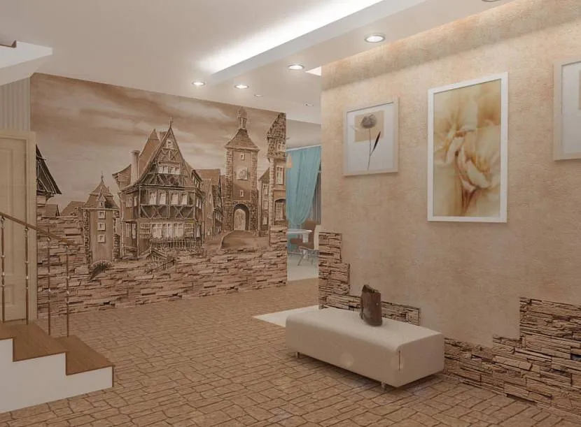 Если в комнате есть окна, то их украшают занавесками. Дизайн прихожей и коридора в частном доме дополняют живыми цветами, если имеется достаточно свободного пространства. Они помогут оживить интерьер. На однотонных стенах великолепно смотрятся картины или фотографии.