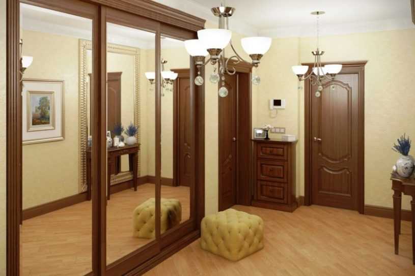 Прекрасно, если места достаточно для размещения шкафа-купе с зеркальными панелями. Это решение зрительно увеличит пространство. В небольших прихожих выигрышнее смотрятся простые зеркала — без тонировки и узоров.