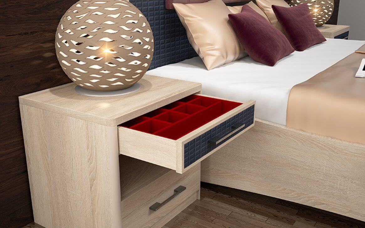 На поверхности тумбочек, в ящиках и на полках должны поместиться все необходимые предметы, к примеру, светильник, часы, декоративные украшения, книги, журналы, косметика.