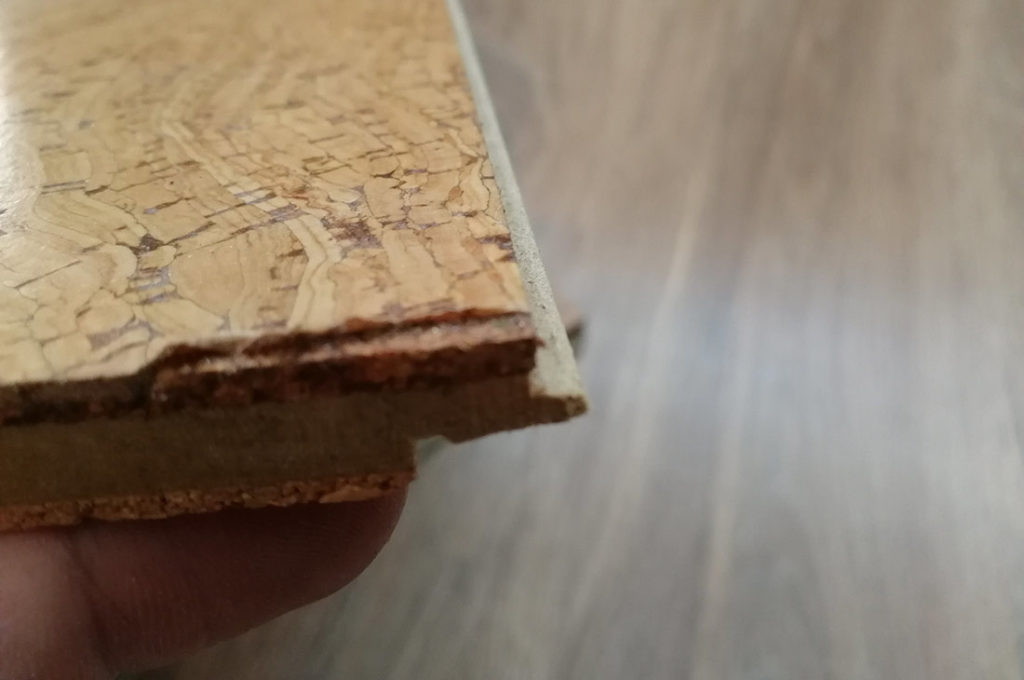 Верхний слой состоит из технической пробки. То, что мы в магазине выбираем различную фактуру, рисунок – это нанесенный тонкий шпон пробкового покрытия. И продавцы, по неведению или с умыслом, не информируют покупателей об этой особенности. А эта деталь и приводит к истиранию и порче всей пробки в процессе эксплуатации.
