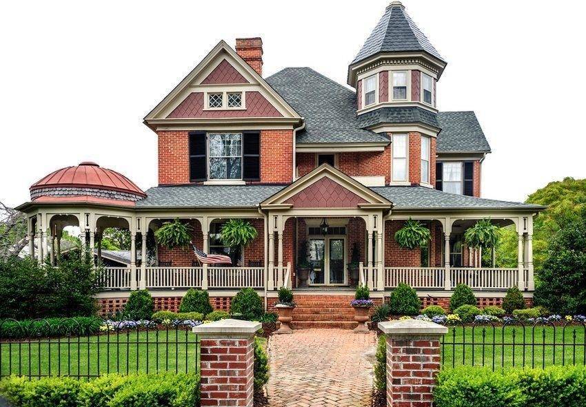 Яркий красно-белый дом с маленькой круглой жилой башенкой