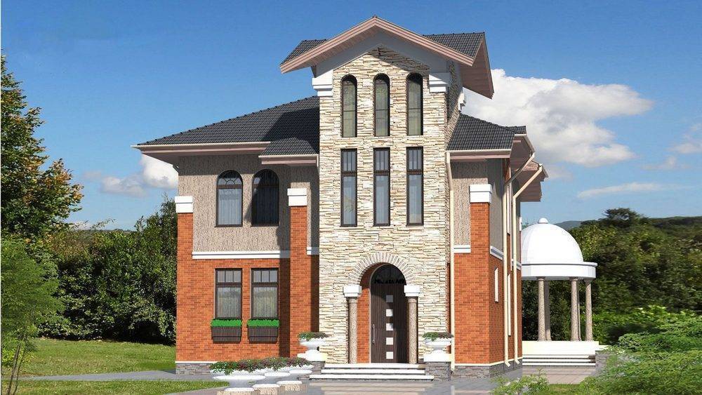 Элегантный загородный особняк стилизованный под средневековый замок. Отличительной чертой дома являются полукруглые детали в планировке дома, увенчанные конусообразными башнями со шпилем. Представленный проект дома чрезвычайно интересен своим оригинальным архитектурным решением, наличием и отделкой деталей фасада, таких как: колонны, арочные окна, окна в крыше дома, карнизы, перила крыльца. Дом не лишен архитектурных «излишеств», подчеркивающих статус и вкус хозяев, что несомненно несколько удорожает процесс строительства, но полученный результат не оставит равнодушными ни хозяев, ни гостей этого по-настоящему красивого и оригинального дома.