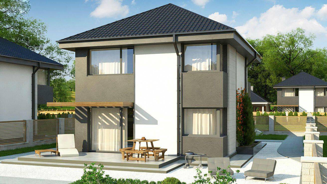 Проект площадью до 100 м2. Для семьи из трех-четырех человек комфортным считается жилье с минимальной площадью 50-70 м2. Такие постройки в плане нередко имеют Г-образную форму. Продуманное проектирование позволяет удобно разместить основные помещения: гостиную, столовую (их часто совмещают), кухню, прихожую, одну ванную комнату и личные (спальные) комнаты. Дом в 50 м2 может вместить гостиную, скромную кухню и ванную, пару спальных комнат. Проект нередко предусматривает небольшую веранду или крыльцо; для визуального расширения помещений применяется панорамное остекление.