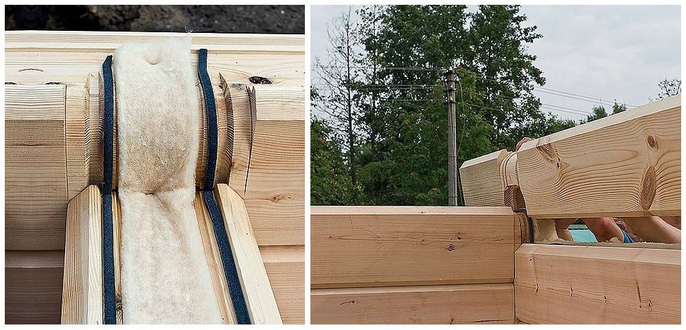 На углах соединение может выполняться в лапу, либо в шунт. Зачастую длина готовых стен из клееных брусьев достигает 6,5 метров. Когда эта длина становится выше определенного значения, желательно оборудовать вертикальные элементы для сжатия. После того, как строительные работы будут закончены, каждая щель и место соединения деревянных элементов хорошенько конопатятся.