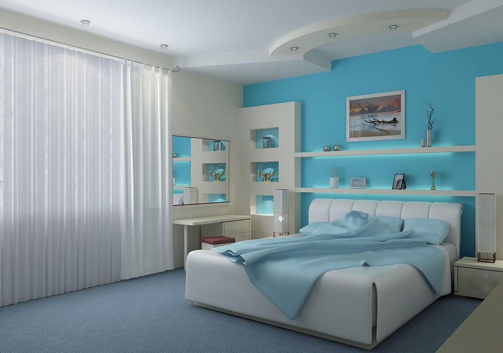 Выбирая цвет стен в интерьере дизайна своей спальни, обращайте внимание на цвет мебели, так как если мебель светлая лучше всего будут смотреться светлые обои, особенно если комната не слишком большая. Предпочтение отдаётся белому, бежевому, голубому и светло-зелёному цветам