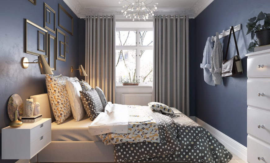 Если же без шкафа никак не обойтись, лучше поставить его в самый темный угол, где на нем реже всего остановится взгляд. На большинстве фото планировок спальни показано именно такое решение.
