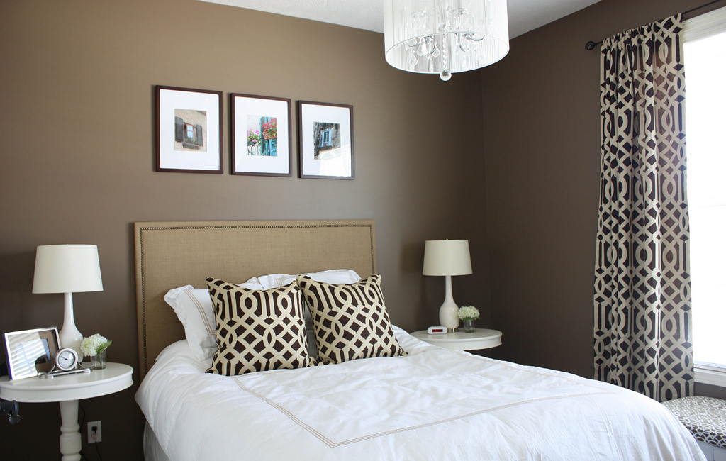 А если спальня с тёмной мебелью, то отлично подойдут оттенки тёплых тонов – различные варианты коричневого, бежевого, зелёного и песочного.