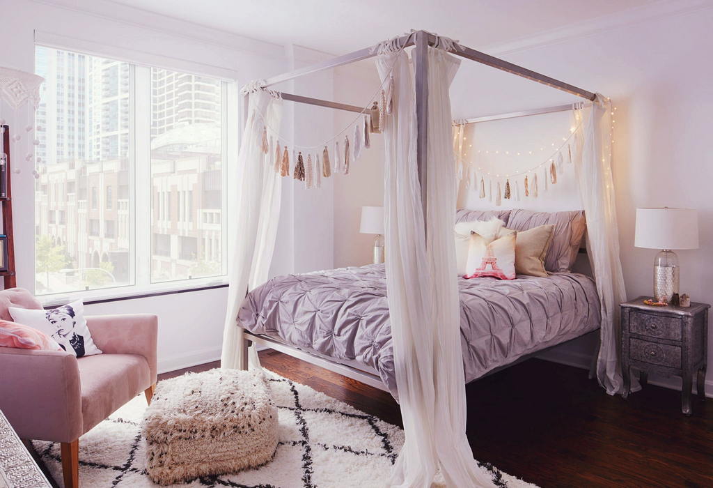 Минимально необходимый набор мебели обязательно включает кровать, прилегающие к ней тумбы, комод. Менее важны платяной шкаф, туалетный столик с пуфом и мягкое кресло с напольным торшером.