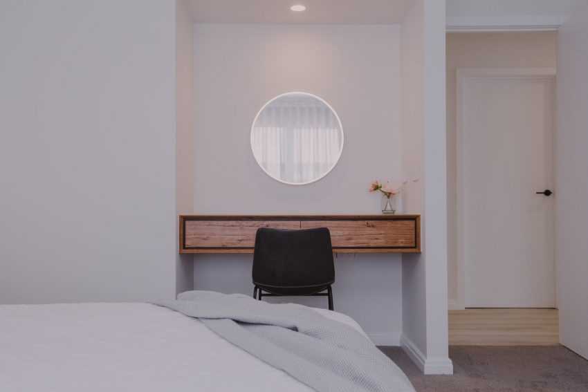 Часто в дизайне спальни также выделяют место для рабочей зоны. Организуйте стол на подоконнике или поставьте его у окна, если солнечные лучи не будут мешать вам при выполнении дел. В солнечных спальнях лучше расположить стол у стены, торцом к оконному проему. Если стол подойдет только легкий и компактный, то кресло может быть как классическим и невзрачным, так и акцентным.