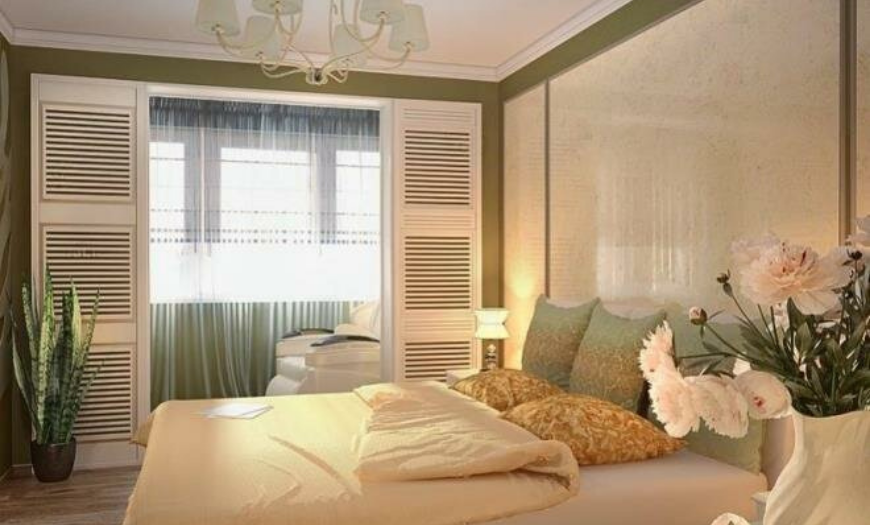 При наличии балкона в спальне рекомендуется его утеплить и объединить с основным помещением. Дополнительную площадь можно приспособить под зимний сад, рабочий кабинет или гардеробную. Для зонирования пространства используйте подоконную тумбу: поставьте на нее горшочные растения и ночник.