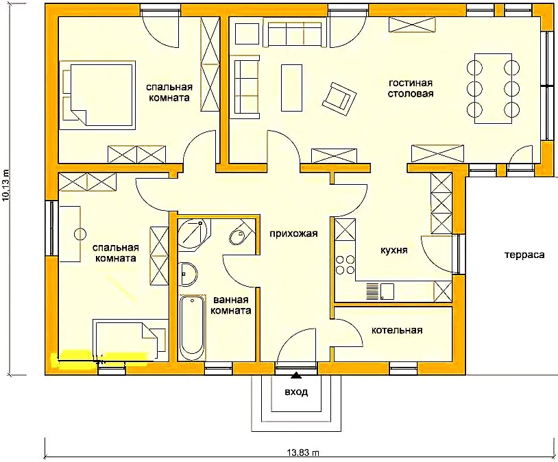 В просторной комнате установлено 3 окна, благодаря чему она хорошо наполняется светом. Еще справа находится котельная и санузел. В левой части имеются 3 спальни — 2 детские, а одна — для взрослых членов семьи. На основе этой планировки можно построить комфортабельный дом для семьи из 4-5 человек.
