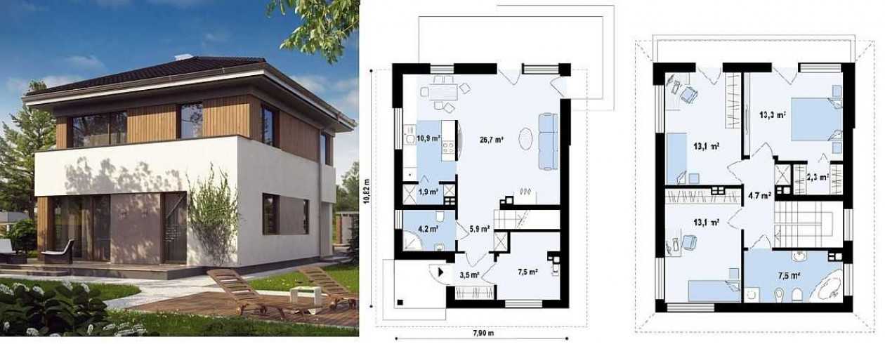 Также можно построить дом с мансардой или полноценным вторым этажом. Первый случай подразумевает изменение уклона кровли, что приводит к снижению высоты потолков и, следовательно, к возможности сэкономить на строительстве и отделке стен.