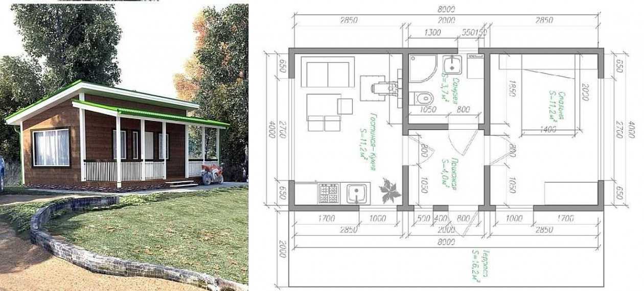 Еще один вариант — одна комната, в которой отведено место под несколько кухонных шкафчиков и плиту, стоит небольшой обеденный стол и есть спальное место. Такая планировка идеальна для проживания одного человека. Неплохо в ней себя будут чувствовать двое. В данном варианте санузла нет, так что придется строить туалет отдельно.