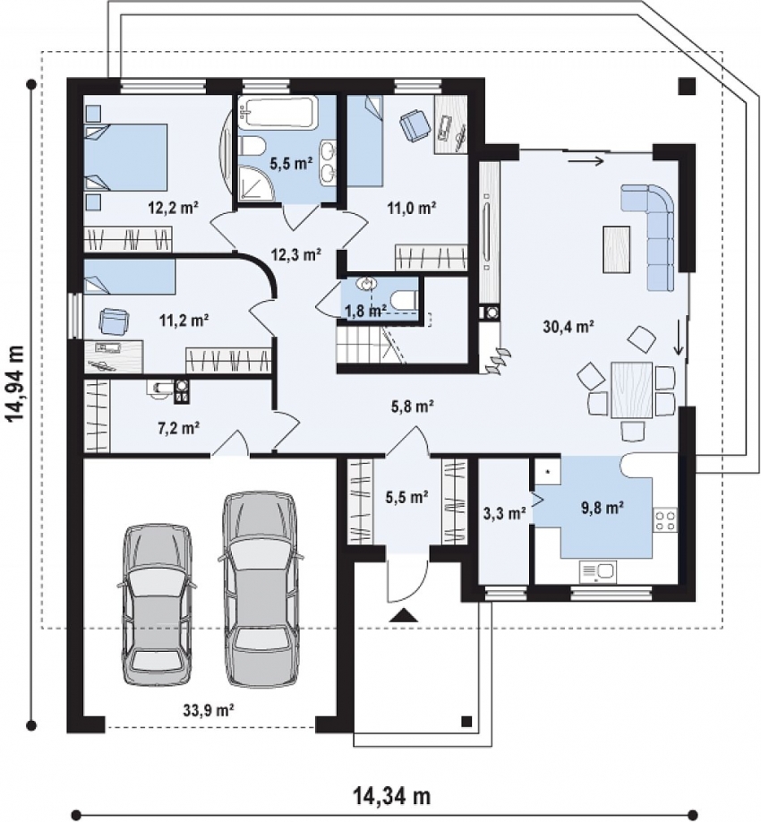 - Увеличение вариантов разделения дома на зоны. Большая площадь предполагает возможность создания в доме отдельных мест для сна, приёма гостей, детских игр.