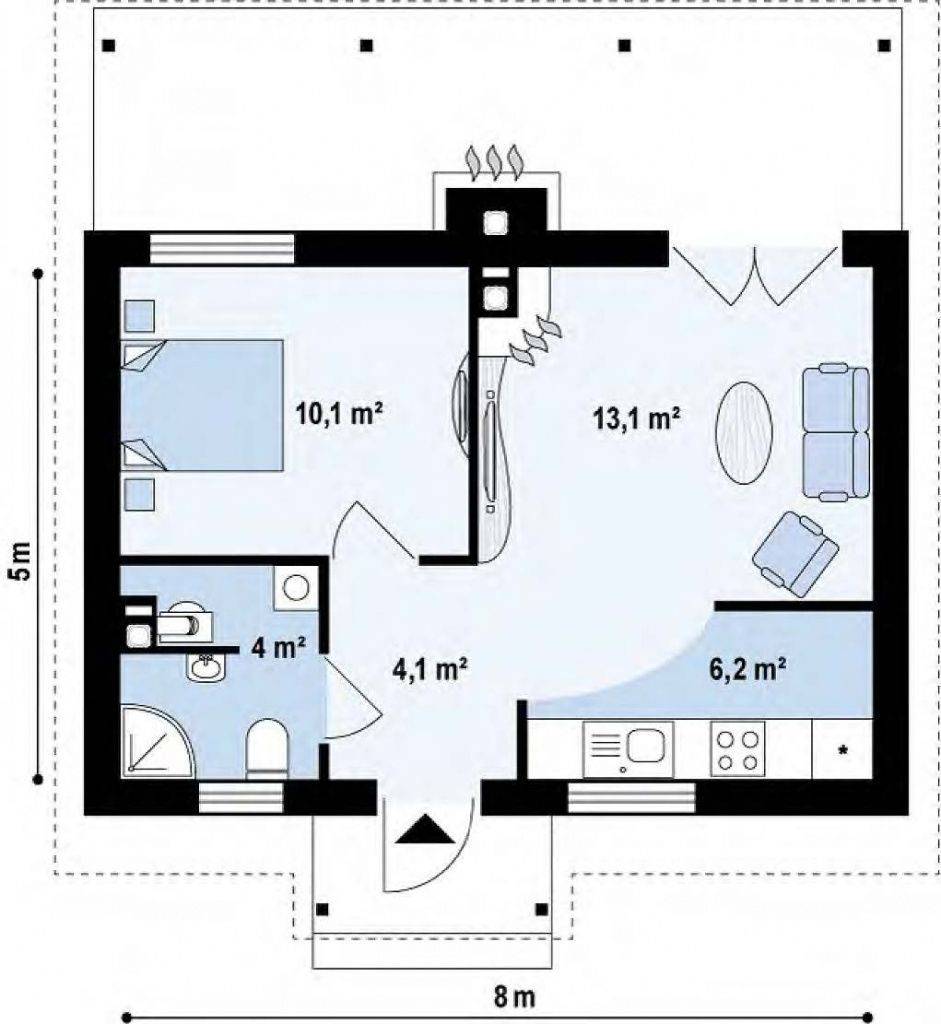 Такой тип планировки используется для небольших дачных домиков с периодическим посещением. Единственная спальная комната ограничивает количество проживающих людей.