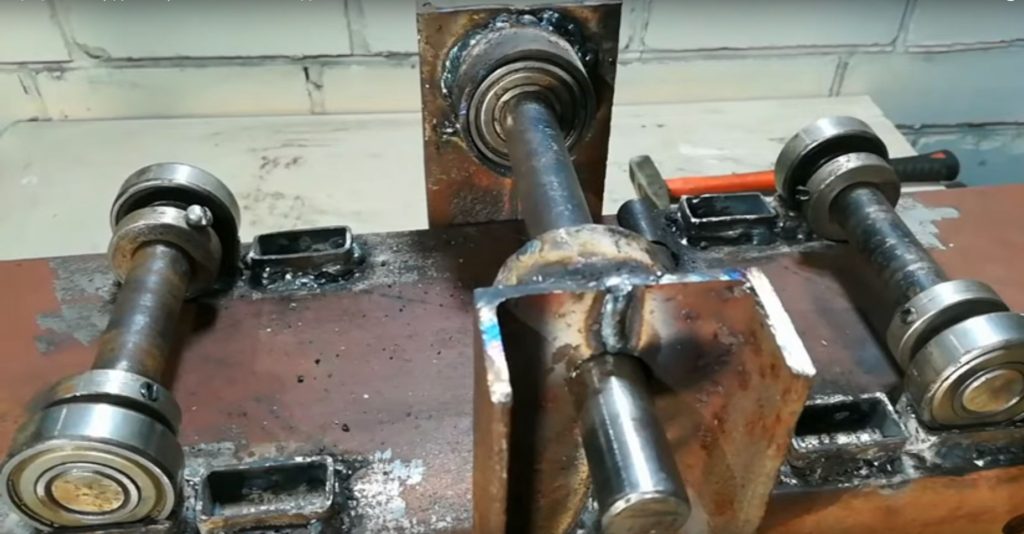 - изготовить ролики и обоймы для размещения подшипников, что может быть достигнуто за счет обращения к услугам профессионального токаря. Всего конструкцией создаваемого устройство предусмотрено наличие трех валов, где один крепится на пружинах, а другие фиксируются в боковинах рамы;