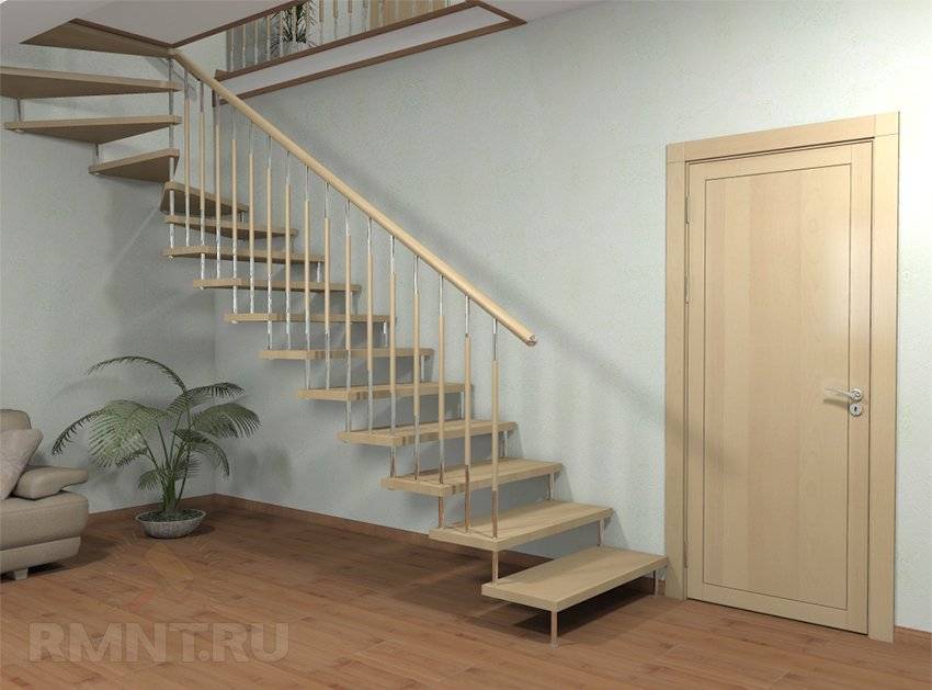 Трехмаршевые с поворотом на косоурах. Делаются с поворотом 180°. Важным показателем является стойкость, нагрузка на конструкцию может меняться. Изначально определяются основные показатели строения, уточняется высота марша, и затем просвет верха конструкции. После этого вычисляется количество подступенков и проступей.