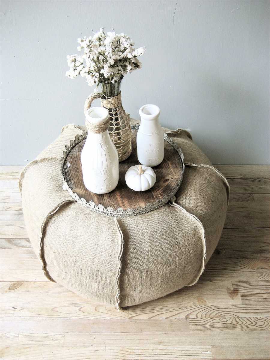 Из пуфа можно сделать отличный столик, разместив на его поверхности поднос, тарелки и другие предметы первой необходимости. Особенно это актуально для тех, кто любит посидеть с чашечкой кофе перед экраном телевизора. Можно даже сделать модульный журнальный столик, поместив стеклянную или другую поверхность на два расположенных рядом пуфа или использовать один большой пуф.