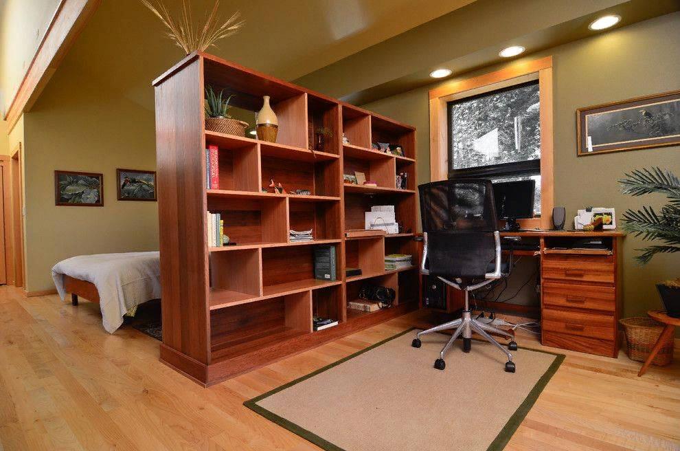 Этот вариант, конечно, самый лучший. Если в вашей квартире есть отдельная комната, которую можно выделить под кабинет, то вам очень повезло. Для помещений со свободной планировкой подойдет другой вариант — отгородите вашу рабочую зону стеной или стеллажом, выделите это место при помощи цвета. Вы можете использовать ширмы или занавески, чтобы создать комфортные условия для работы.