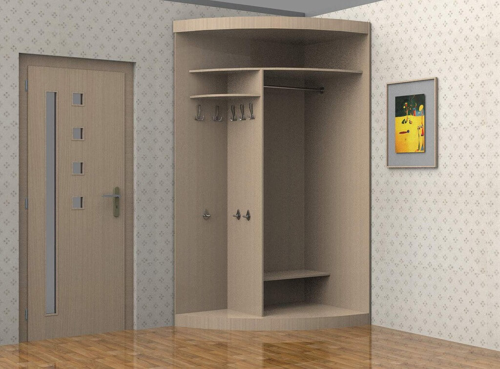 Отдельно следует выделить корпусные радиально сделанные шкафы, которые оснащаются задней и боковыми стенками. Они имеют разные полки, дно и крышку. Не требуется подгонка для такой мебели, поэтому она легко устанавливается в любое место, выбранное заранее пользователями. Корпусные шкафы являются едиными конструкциями, которые легко переставляются по жилому помещению.