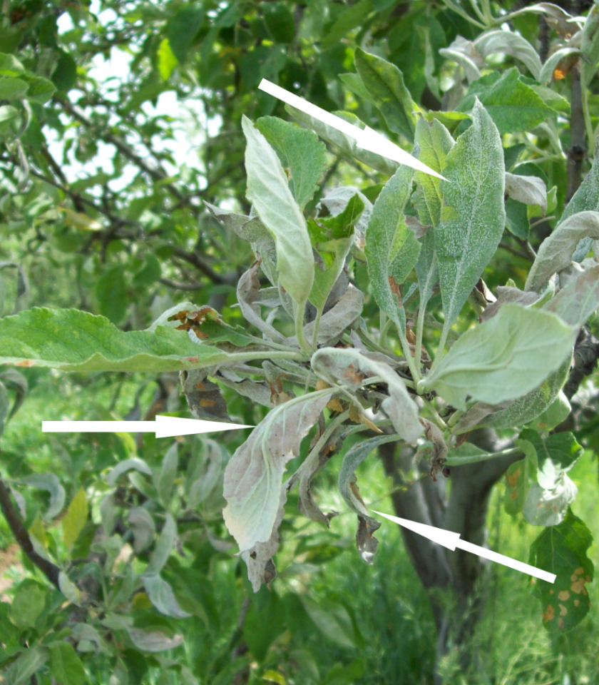 ![]() | Мучнистая роса Симптомы: Начинается все с белого налета, который позже перерождается в коричневые пятна на листве. Яблоня частично скидывает крону и прекращает плодоносить. Лечение: Для профилактики в межсезонье и после цветения дерево опрыскивают Бордоской жидкостью (1 %) и ХОМ. Из препаратов помогает Спор и Топаз, в качестве народного средства используется водный раствор медного купороса с хозяйственным мылом (10 л воды, 50 г купороса и растереть кусок мыла) |