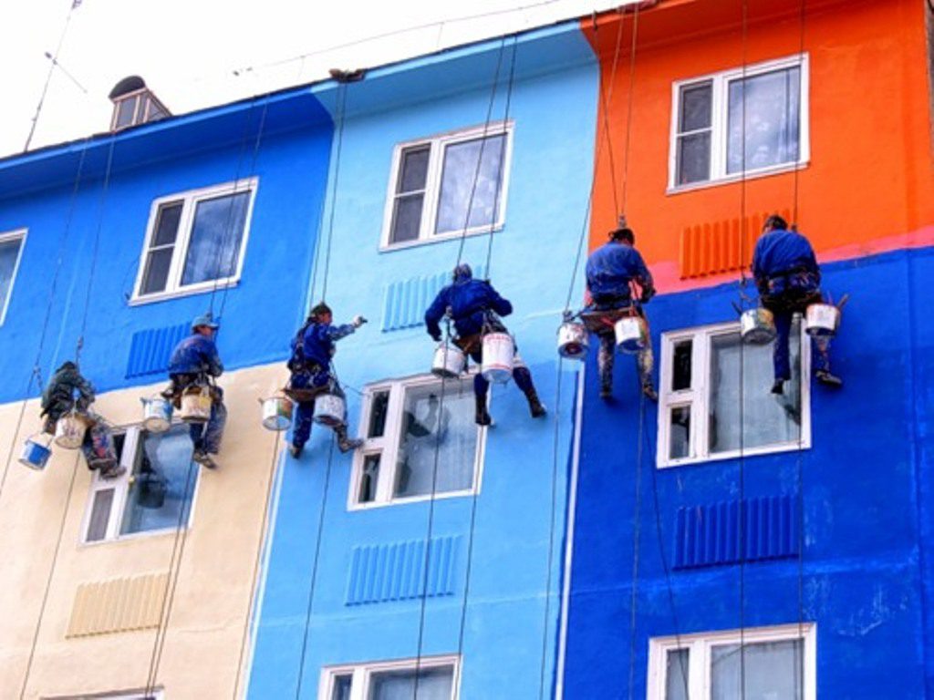 Фасад окрашивается водоэмульсионкой в два слоя, перерыв между которыми должен составлять час-полтора, чтобы дать лишней влаге полностью испариться.
