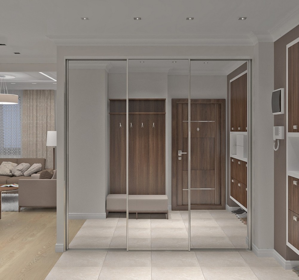 - Стеклянные и зеркальные двери для гардеробной комнаты изготавливаются из упрочненного стекла и зеркал. Такие двери можно устанавливать даже в доме, где есть маленькие дети, так как они полностью безопасны. На внутренней стороне полотна клеится специальная пленка, которая не дает осколкам разлетаться по комнате в случае разбивания. Стекло и зеркала — универсальный материал для отделки раздвижных дверей.