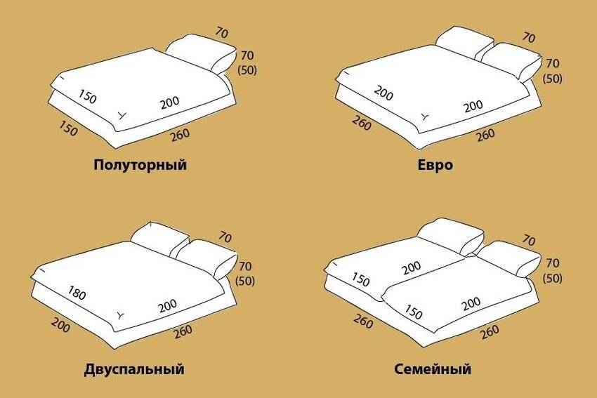 Есть также семейный вариант комплекта постельного белья, идентичный европейским, но с индивидуальными одеялами для двух человек. Для выбора правильного белья запомните правило: размер пододеяльника должен быть на 5 см длиннее и шире одеяла. Для определения размеров простыни накиньте 20 см на длину матраса и 40 см на ширину.