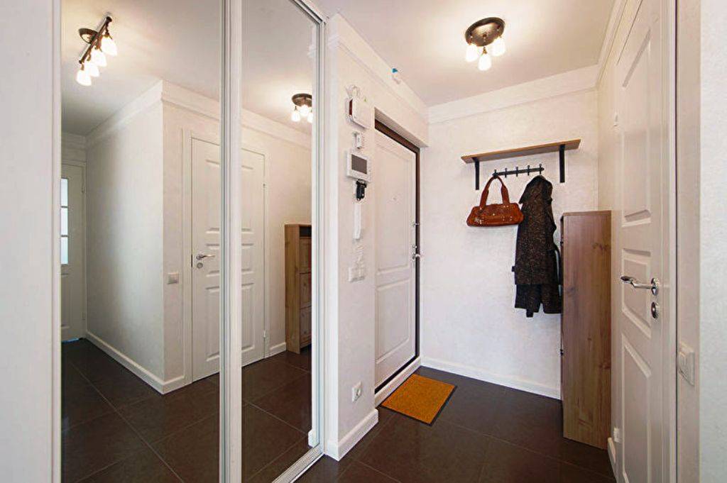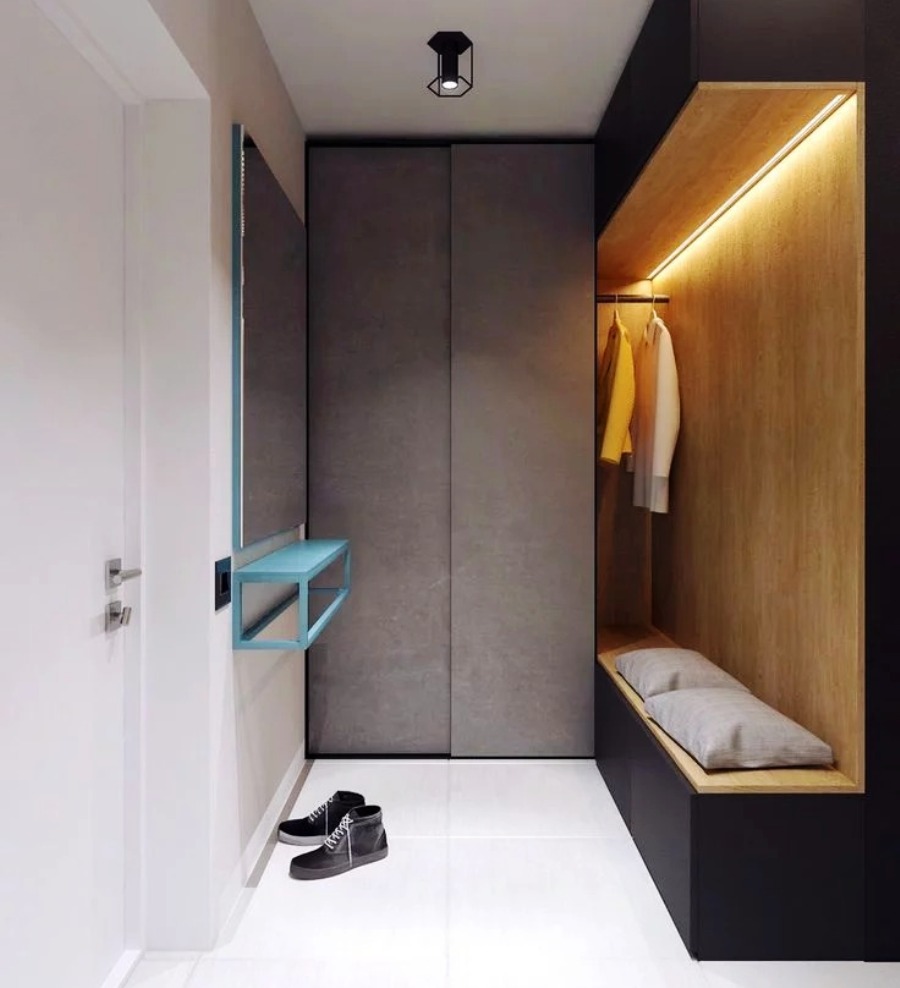 Лучшим выбором мебели для узкого пространства станет шкаф-купе, зеркало и тумбочка для обуви. Ну а пара дополнительных светильников на стенах визуально сделает прихожую шире.
