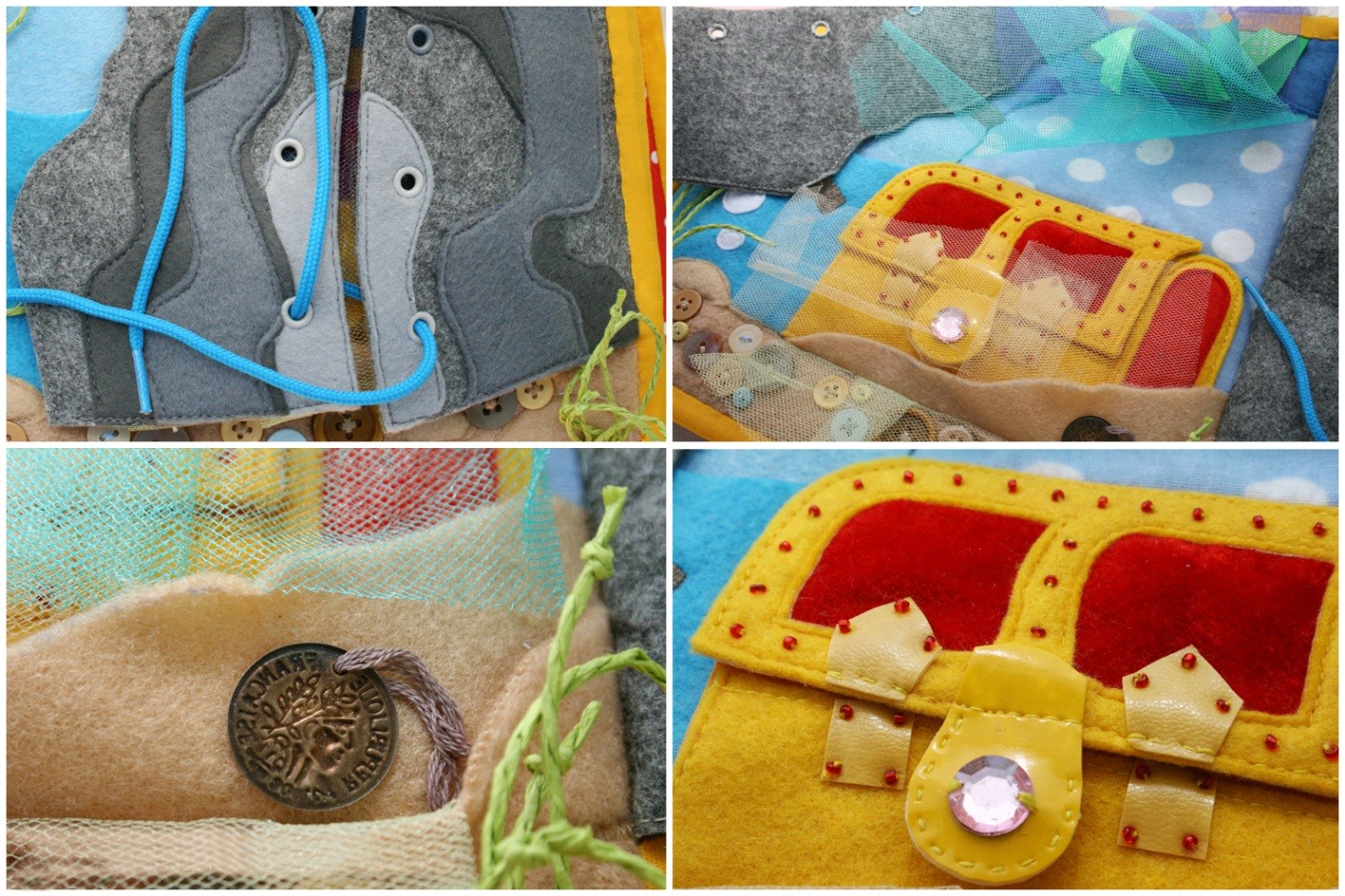 Правая верхняя деталь – замок. Он вшивается в кусочек ткани, который в свою очередь пришивается к поверхности коврика. Внутри такого элемента хорошо сделать кармашек, чтобы открывая молнию, малыш находил внутри какой-нибудь сюрприз.