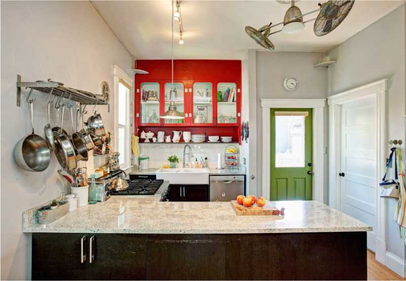 Так, например, нет смысла вешать на рейлинги весь запас кухонных принадлежностей и кружек – ведь если не пользоваться ими каждый день, они будут покрываться пылью и в нужный момент вам придется потратить время на то, чтобы ополоснуть утварь. Да и развешивать помытые приборы по крючкам не слишком удобно.