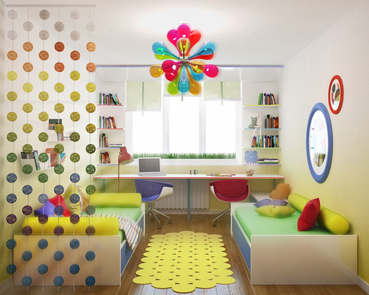 - можно разделить рабочие зоны по цветам: учебная зона – холодные зеленые, голубые, спальная – пастельные, игровая – яркие оттенки;