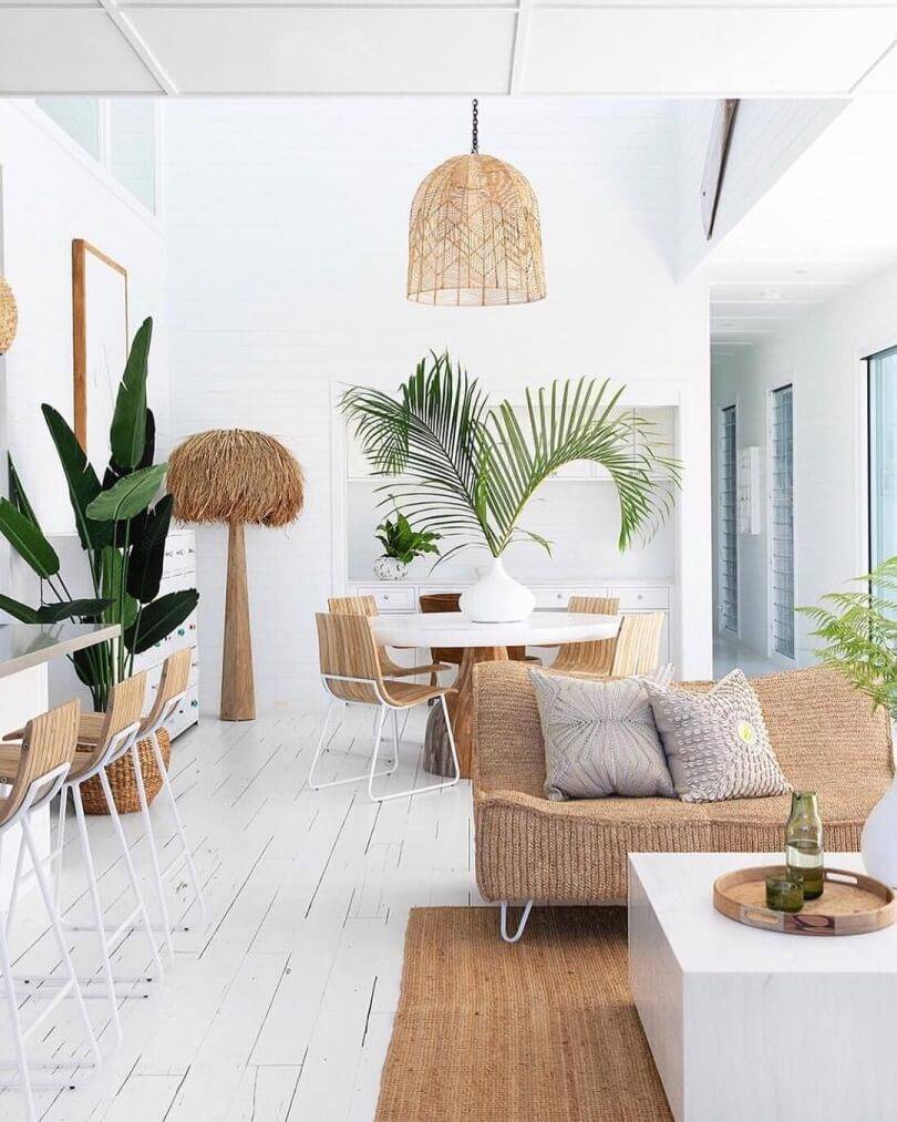 В качестве необычной идеи гостиной 2022 предлагаем использование полупрозрачных расписных перегородок в ориентальном интерьере. Они украсят и тотально белое минималистическое оформление.