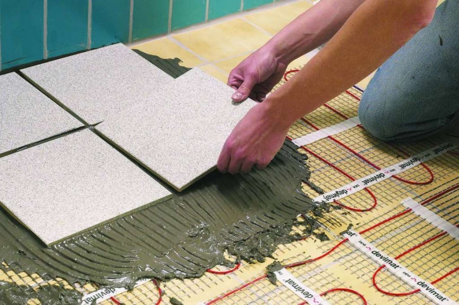 Напольная плитка укладывается на монтажный клей. Здесь лучше избежать наличия швов. Клей наносится на при помощи шпателя на изнаночную сторону плитки и на сам пол.