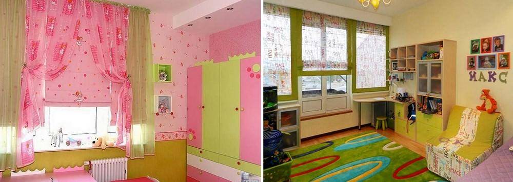 Если в комнате живут двое детей разного пола, то пространство лучше разграничить на две зоны. Одну часть комнаты украсить в нежные цвета, а другую в цвета с холодным оттенком, при этом окно тоже стоит декорировать шторами разного цвета.