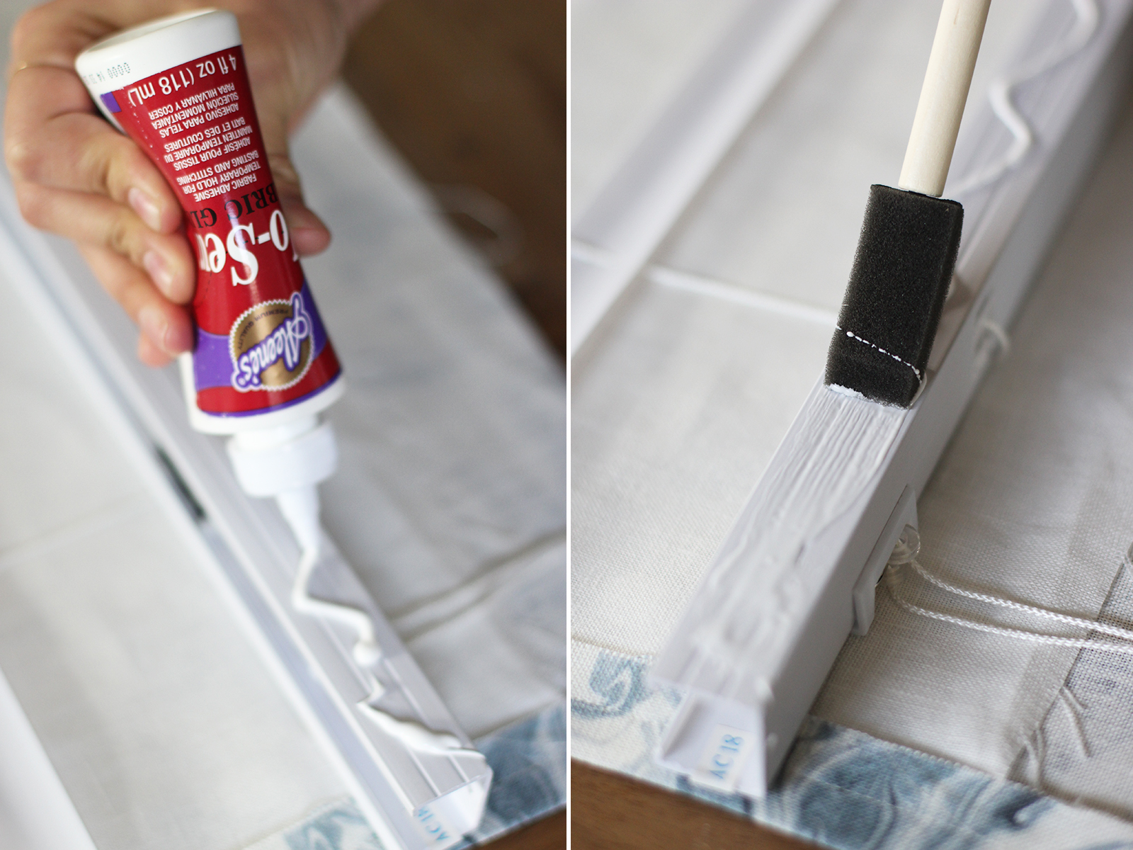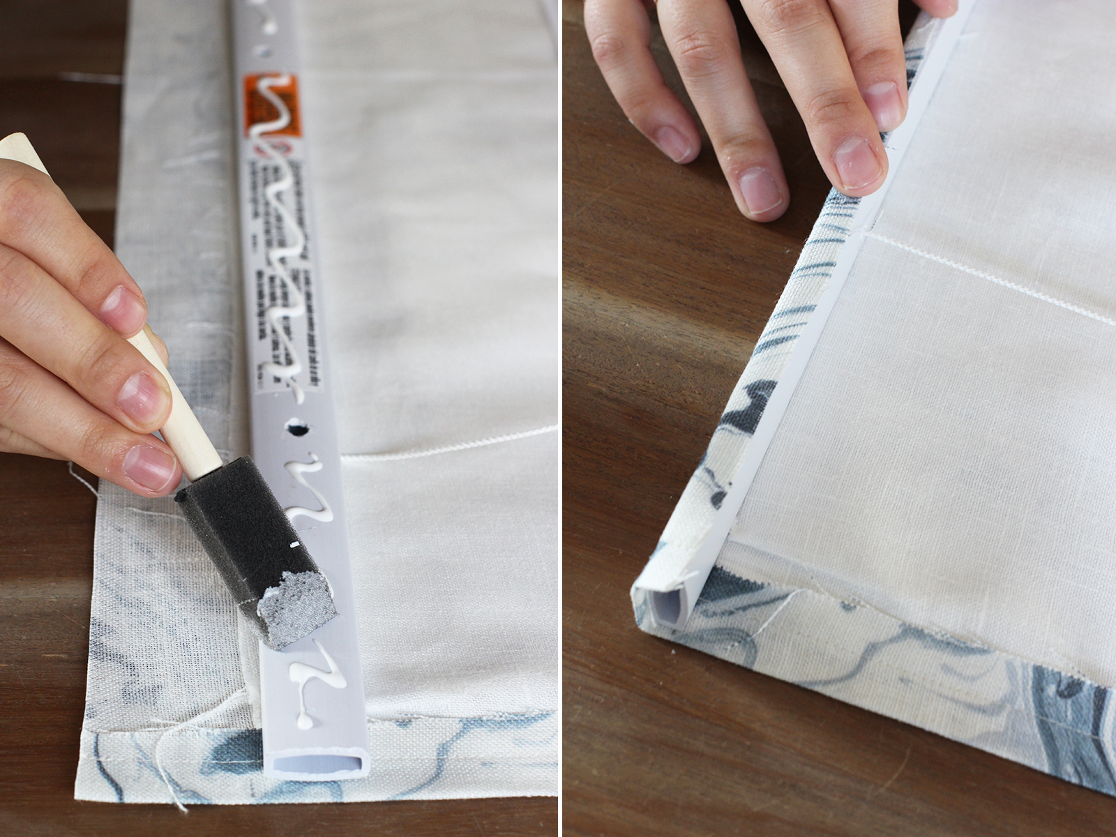 Распределите клей по нижней и боковой части нижнего планки и оберните ее тканью. Вы можете аккуратно обрезать излишки ткани после того, как клей полностью высохнет.