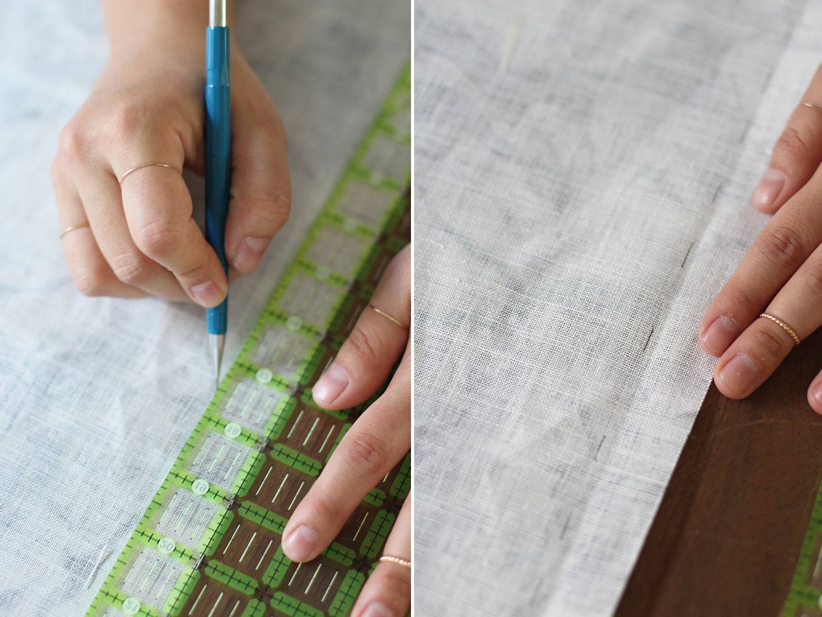 - Линейкой следует отметить места расположения карманов для прутиков. От каждой отметки отступ должен составлять 1,25 см. По этим линиям будет проходить строчка, которая образует проем.