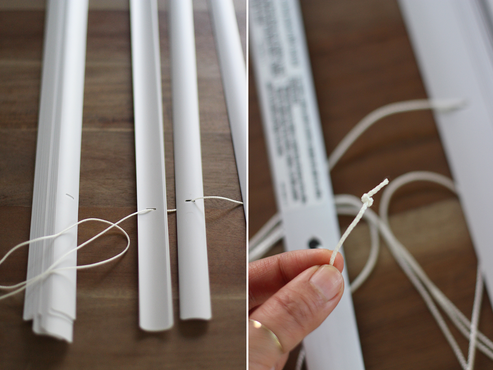 Теперь нужно снять лишние ламели. Под нижней планкой жалюзи находятся 2 пластиковых колпачка. Откройте их и используйте иглу или булавку, чтобы выловить завязанные шнуры. Отрежьте узлы и снимите нижнюю планку.