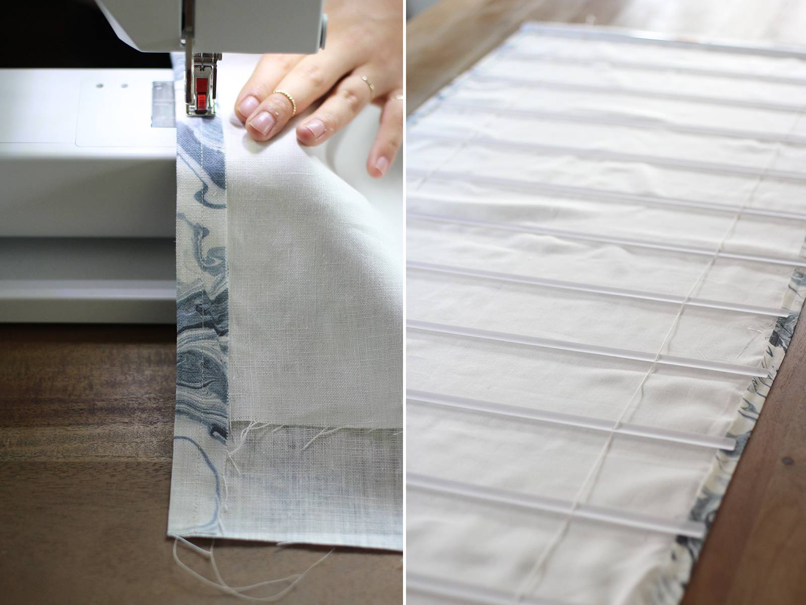 Далее можно пойти двумя путями: закрепить подгиб булавками и отстрочить на швейной машинке или использовать двустороннюю клеевую ленту и закрепить подгиб при помощи утюга. Не беспокойтесь о верхней и нижней части ткани — оставьте их необработанными. Положите ткань лицевой стороной вниз. Поверх ткани положите жалюзи. Разделите жалюзи так, чтобы все они были равномерно распределены по длине ткани. Отметьте их расположение тканевым маркером или карандашом, если хотите застраховать себя на случай съезжания их во время работы.