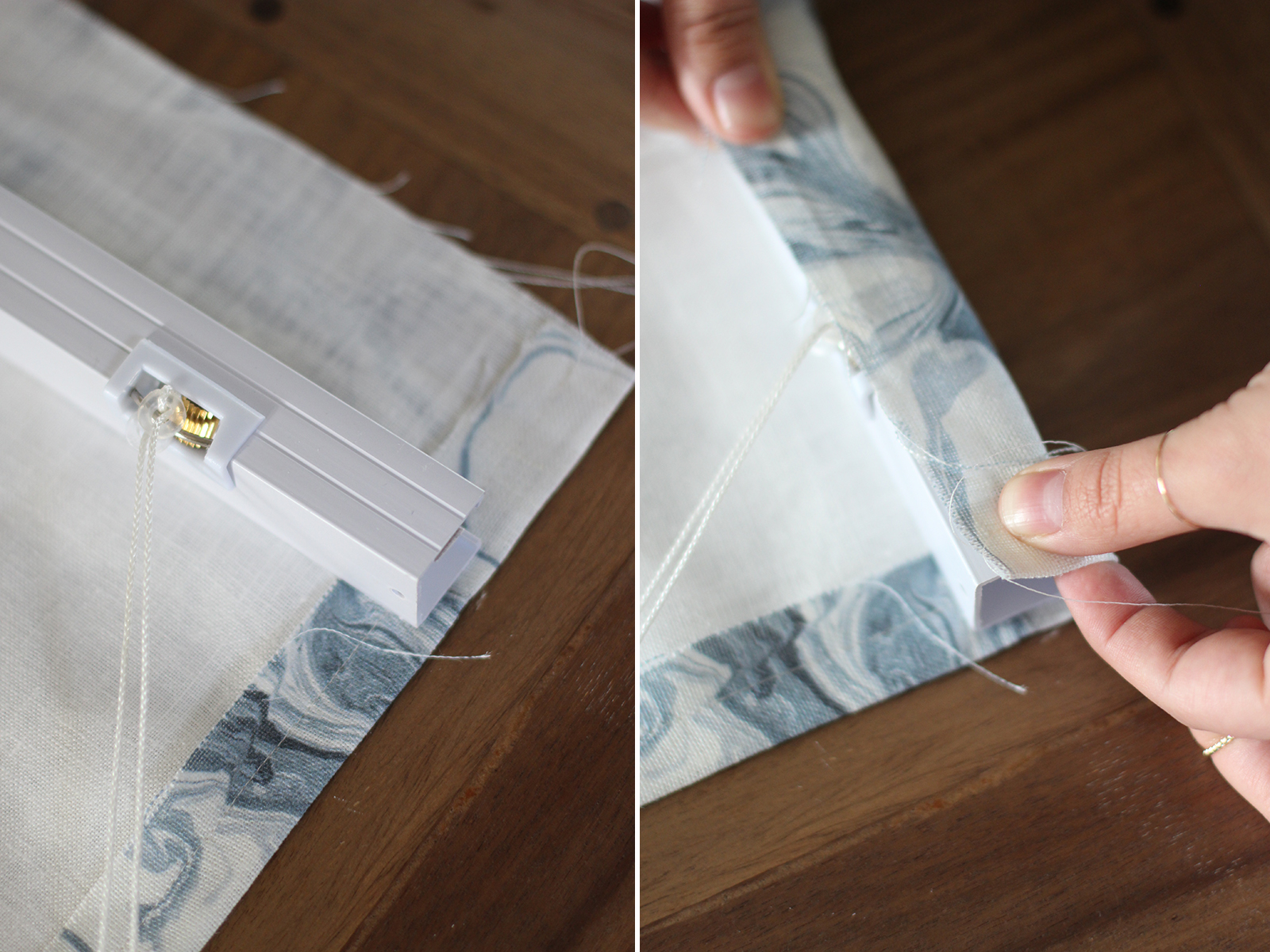 - К верхнему краю полотна, на лицевую часть, приклеивается верхний ограничитель. Нити, свисающие с него, пропускаются через отверстия в ламелях. Свисающие концы приклеиваются к ткани.