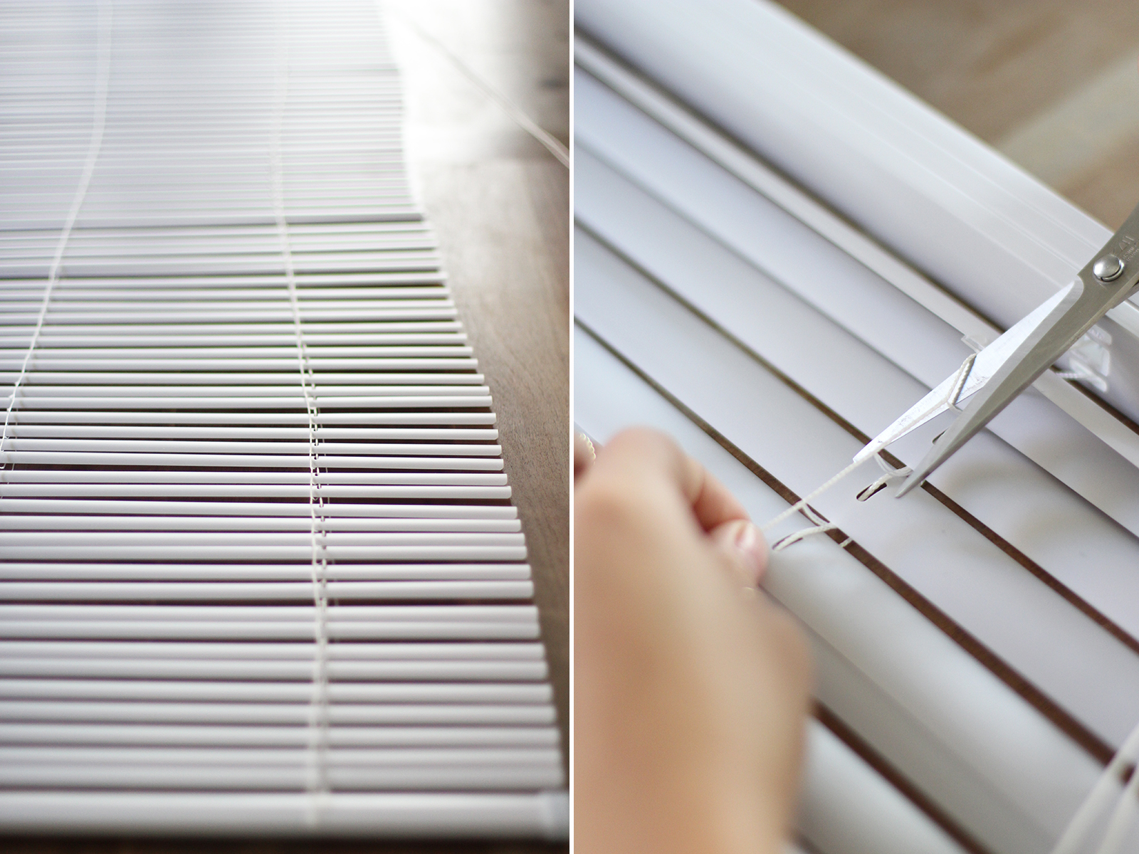 Для работы необходимо жалюзи снять с окна, разложить их открытыми на полу или длинном столе и отрезать лестничные тросы. Они проходят по краям, в то время как тяговые — ближе к центру.