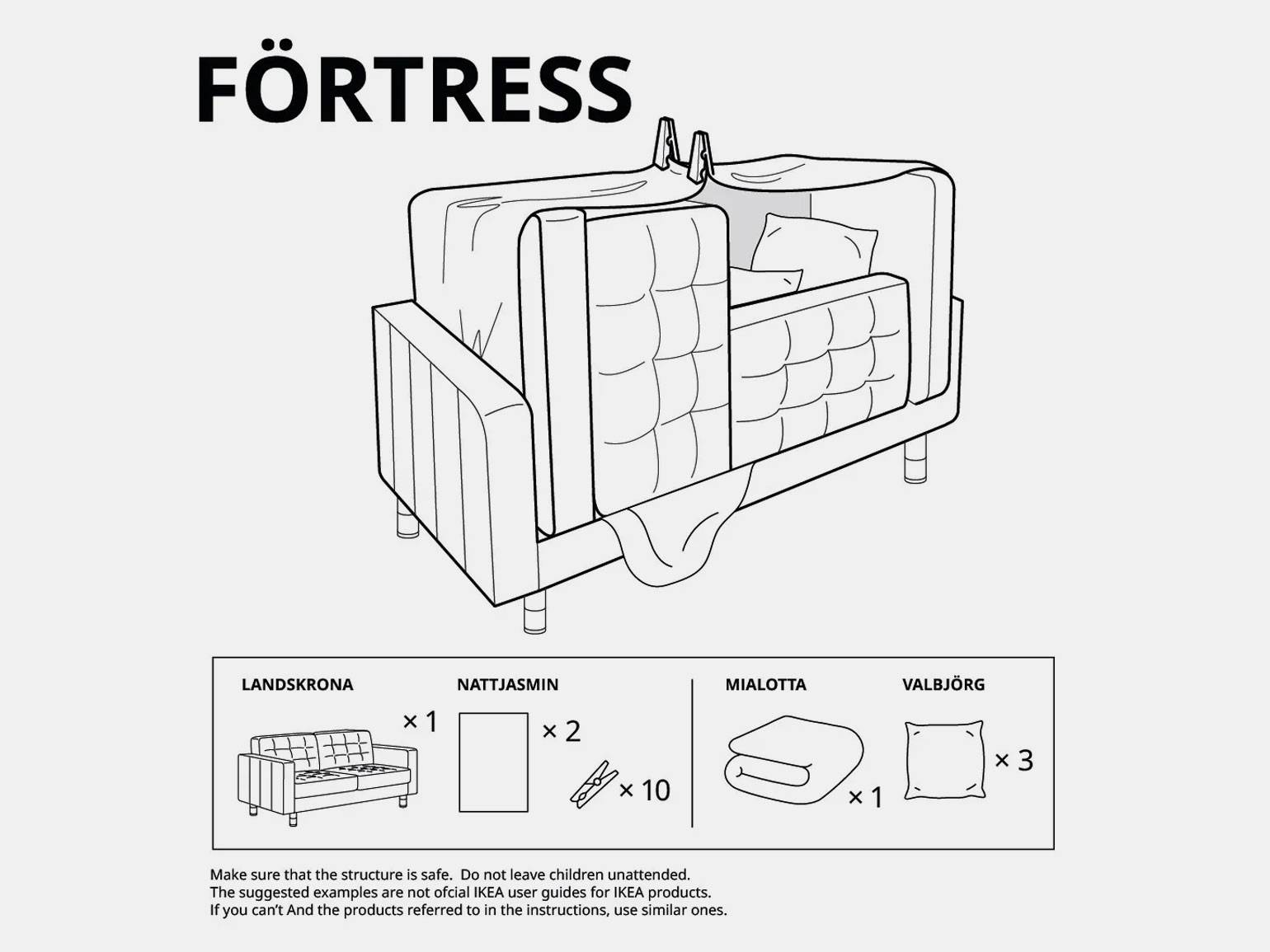 Концепт крепости от агентства Instinct для IKEA: по этому техническому рисунку понятно, что должно получиться из диванных подушек, простыни, покрывала и прищепокИзображение: IKEA