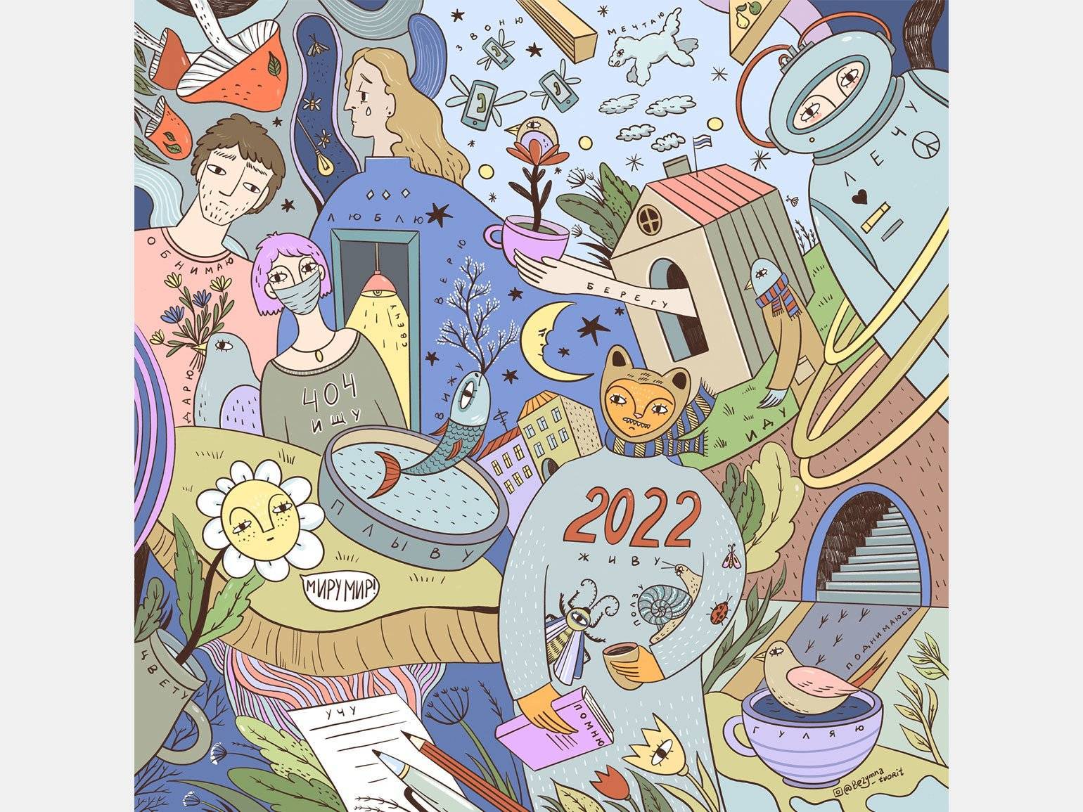 Обложка календаря. Образы на поверхности расположены плотно — так требует стиль дудлингаИзображение: Varvara Nevzorova / Behance