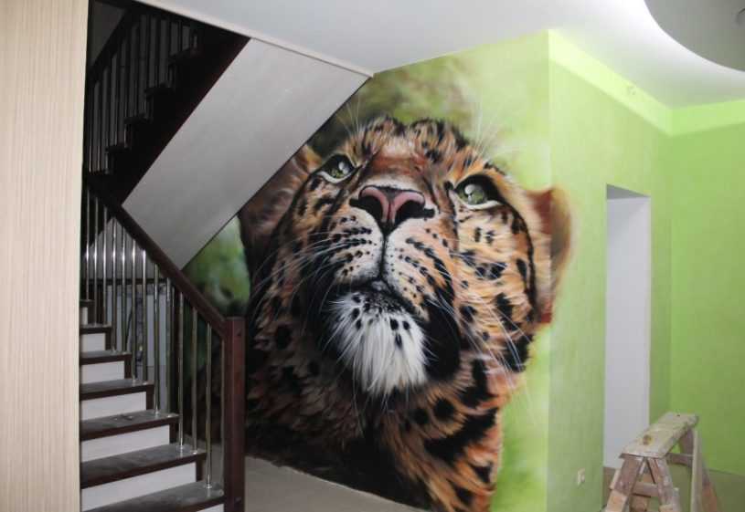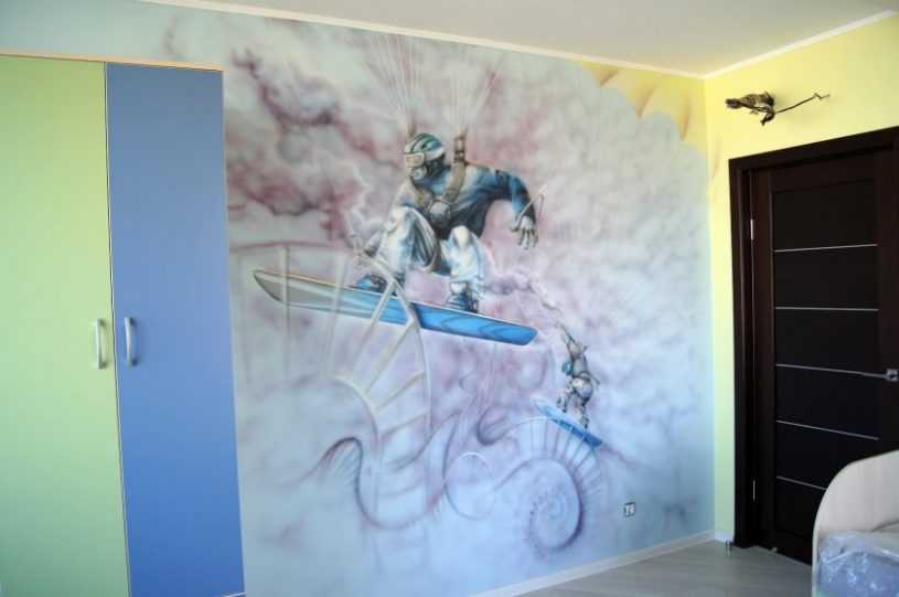 - Рисунки на стенах, занимающие огромные площади, легче претворить в жизнь аэрографом (немного видоизмененный краскопульт) или красками, что в аэрозольных баллончиках.