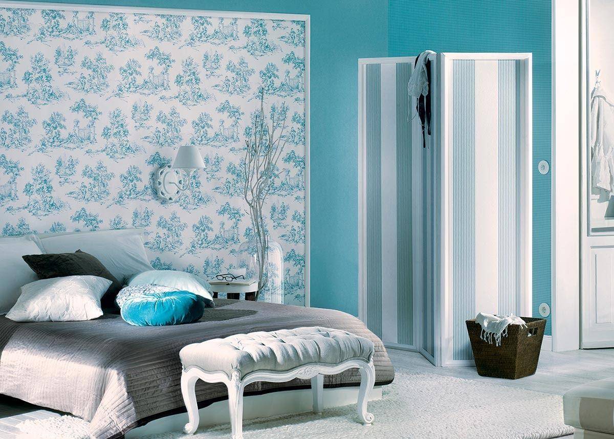 А вот если покрыть стены бирюзовыми обоями, а поверх них нанести серебристый орнамент, придаст комнате уникальности и необычности.