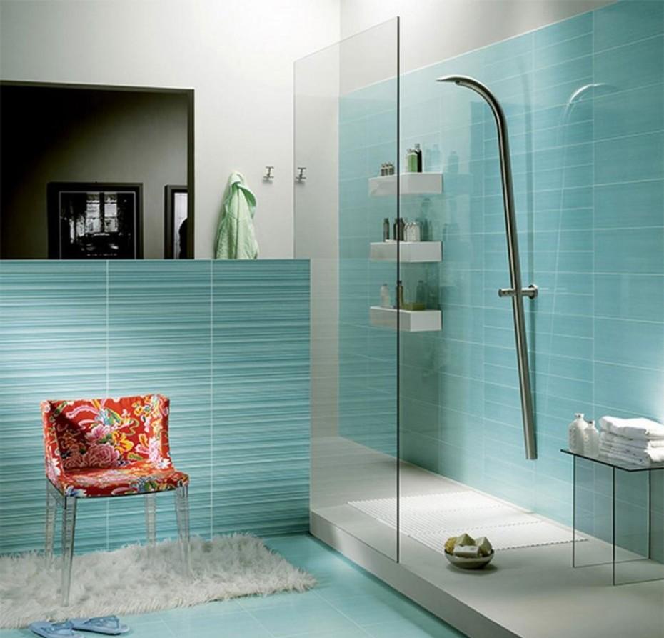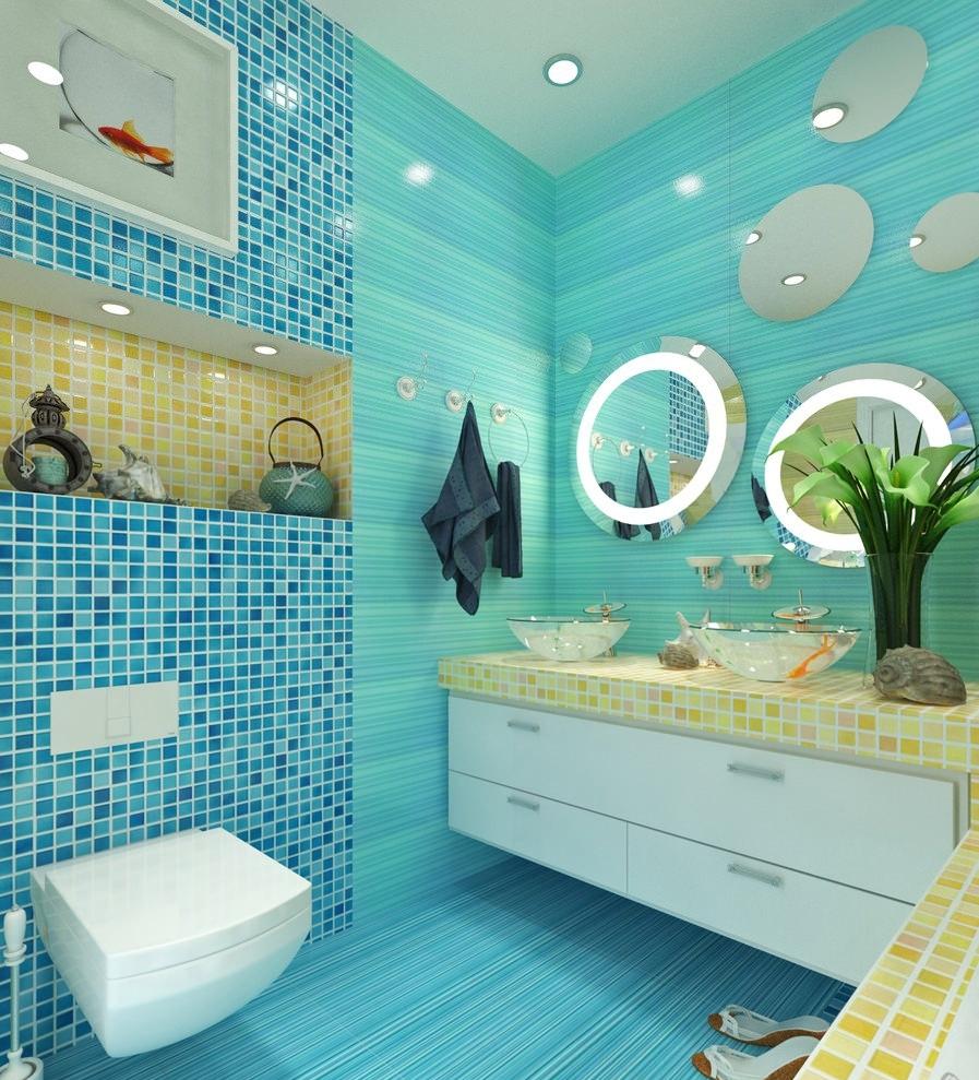 Ванная комната – помещение, где бирюзовый цвет должен находиться по праву. Чтобы в комнате было тепло, цветовая гамма дополняются цветами из бирюзовой палитры. Если интерьер дополняется мозаикой, она может включать в себя разный декор, который будет оригинальный и интересный.